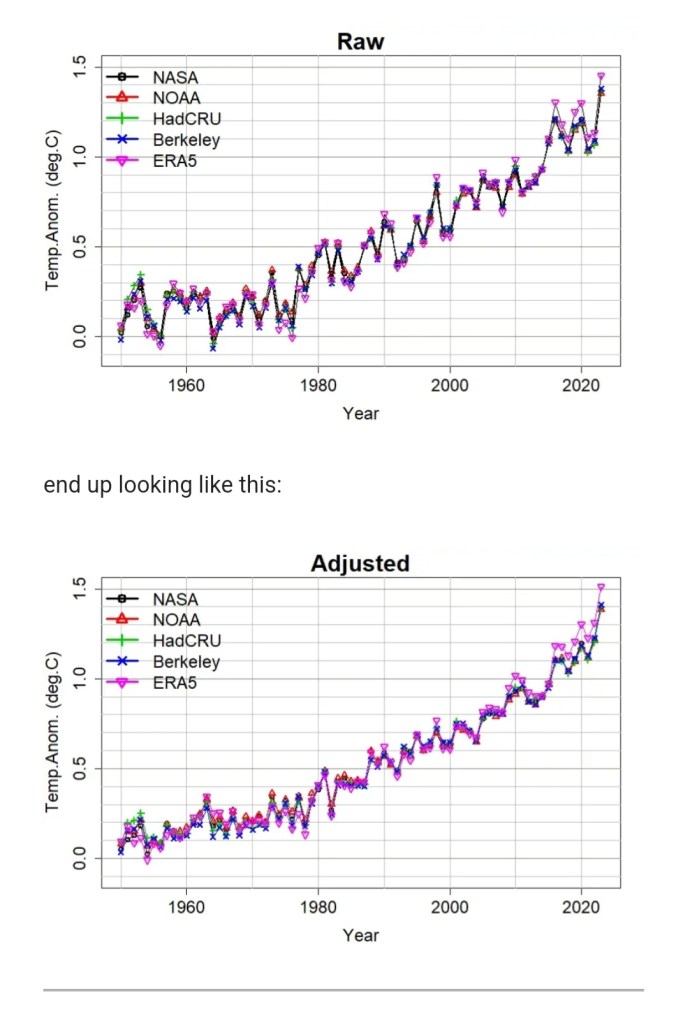 Der Statistiker Grant Foster hat fünf Datensätze zusammengefasst und kam zu einem neuen Ergebnis. Er schreibt: Bereits im Jahr 2011 habe ich zusammen mit Stefan Rahmstorf (Foster & Rahmstorf 2011, im Folgenden FR11) einen Artikel verfasst, in dem wir die globale Temperatur angepasst haben, um (so gut wir konnten) den Einfluss von Faktoren zu beseitigen, von denen wir wussten, dass sie nur vorübergehend waren und nicht menschengemacht. Konkret handelt es sich dabei um Vulkanausbrüche (deren Aerosole den Planeten abkühlen), die El-Niño-Südoszillation (ENSO, die die Welt in ihrer positiven El-Niño-Phase erwärmt und in ihrer negativen La-Niña-Phase abkühlt) und Sonnenschwankungen (wenn die Sonne heißer oder kälter ist, so auch die die Erde). Diese exogenen Faktoren führen dazu, dass die globale Temperatur schwankt, aber nicht wirklich etwas bewirkt; durch die Beseitigung ihres Einflusses wird der Teil der globalen Erwärmung klarer.