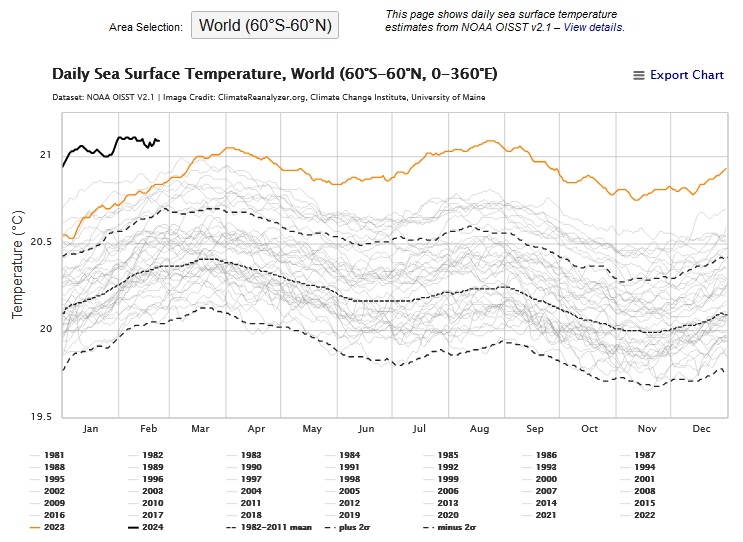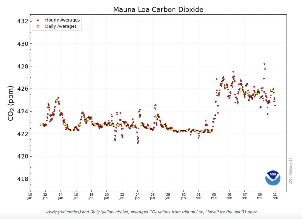 Das hängt auch mit der CO2 Emission zusammen, die auf 428 ppm gestiegen ist. Der vorindustrielle Wert war 280 ppm. Das ist eine Steigerung um 148 ppm. (Quelle: Mauna Loa Hawaii, 11.2.2024)